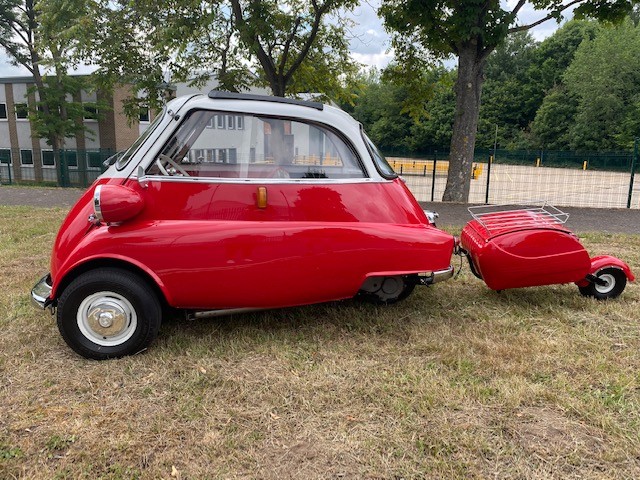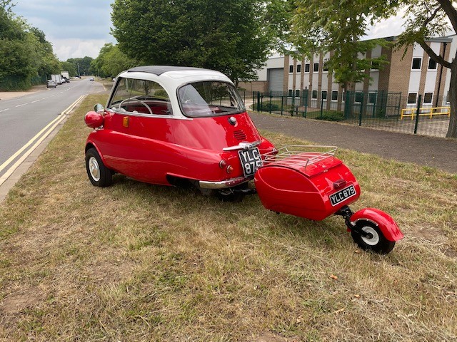 1960 BMW Isetta 300 in red with matching colour trailer. Built by the Italian firm of Iso, the Isetta caused a sensation when it was lunched at the Turin Motor Show in November 1953. Unlike anything seen before, not only was it small (only 7.5ft long by 4.5ft wide) and eggshaped with bubble-type windows, but the entire front end of the car hinged outwards to allow entry and exit. The steering wheel and instrument panel also swung out with the door as this made access to the single bench seat easier. The Isetta soon captured the attention of BMW who made a deal to design and manufacture their own version of the car under licence. BMW quickly made many changes, including a new 247cc single-cylinder four-stroke engine, borrowed from the BMW R25 motorcycle, that made 12bhp and boosted top speed to around 50mph. In 1956 they fitted longer side windows and a larger 298cc engine to produce the BMW Isetta 300, now with a heady 13bhp and improved torque that made hill climbing a little easier. Between 1957 and 1962 BMW also produced the 300 in RHD at a factory in the former Brighton railway works.