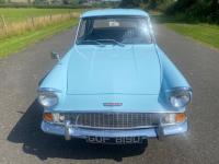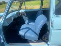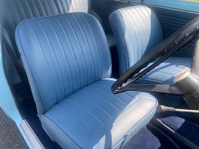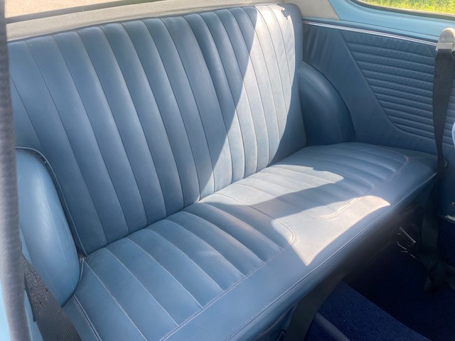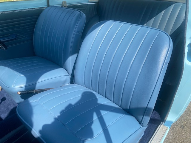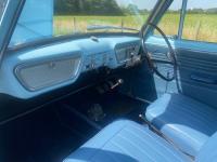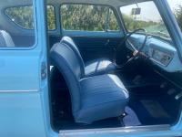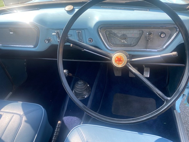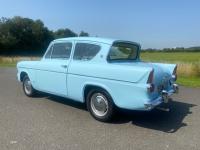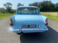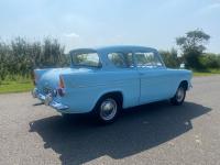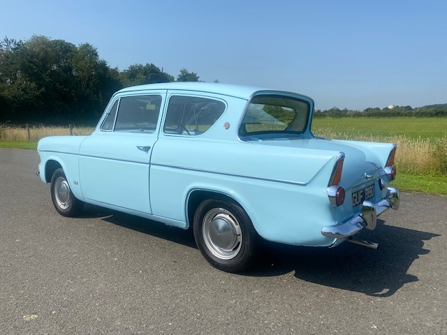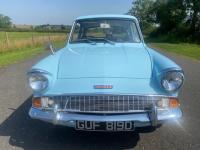 1966 Ford Anglia 105 E Deluxe in Blue with a Blue interior. Ford's fourth and last Anglia - the 105E - broke cover in 1959. The styling displayed a strong American influence and included a sweeping nose, notchback rear window, and muted tail fins. The newcomer benefited from an equally new engine, a 997cc OHV straight-four unit codenamed `Kent', versions of which powered all manner of Fords for years after. It was mated to a four-speed manual gearbox with synchromesh on the top three ratios. The suspension was by MacPherson strut at the front and leaf-sprung live axle at the rear.