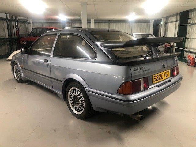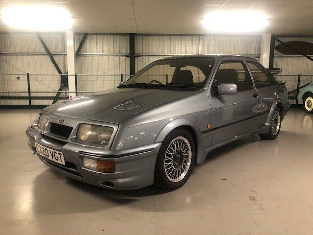 Disappointingly slow sales of the distinctively shaped Ford Sierra after its introduction in 1982, suggested that a serious marketing boost was required, and it was the obvious choice to become the platform for Ford's new competition aspirations. It was rear-wheel drive, had good aerodynamics, albeit being prone to lift at high speeds and it was available as a three-door. A wind-tunnel developed body kit and rear spoiler would sort out the lift issues but, more importantly, Ford still needed to build 5,000 units for motorsport homologation, somewhat worrying when Stuart Turner's initial approach to the dealer network came back with an estimate that indicated that they could sell around 1,500 units! The successful eventual sales record is of course history. Ford went on to sell 5,545 three-door cars including the RS500, of which only 500 were built, and the Cosworth engine also found its way into nearly 30,000 Ford Sierra Saloons (Cosworth 3dr, Sapphire 2wd, and 4wd). The Sierra Cosworth comfortably exceeded Ford's best expectations and it went on to become one of the most successful 'Touring Car' racers of all time, winning races all over the world. This, very special, 1987 RS500 (No 484) has covered just 25,769 miles as it has been kept in dry storage since 1992. The car was initially supplied new to it’s first keeper a Mr David Robert King who acquired the car on 2nd September 1987, he then sold this on to its next owner who acquired the vehicle on 18th May 1988 who the proceeded to use the vehicle for the next couple of years until putting the car into dry storage for personal reasons in 1992. During the previous owners tenure the car was MOT’d on 1st September 1990 with a recorded mileage of 24,024. The next MOT took place on 17th September 1991 with a recorded mileage of 25,388. Due to a change in personal circumstances the owner then decided to put the car into dry storage where it has remained untouched, we haven’t even cleaned the car as want to keep it in its exact condition. This car will need recommissioning as it has not been used for 18 years, the previous owner did have a quote from a specialist which I have on file from September 2016 for this to be done which was for £1000 but we advise that you should get a quote for this yourselves from a specialist. The car will need a new timing belt, new battery, flush out and re-fill of all fluids etc to get this rare Moonstone blue RS500 back on the road to be enjoyed. The spare wheel having never been used still showing its original manufacturing marks. The interior is in excellent condition. The dashboard and door cards are unmarked and the seatbelts with vibrant red push buttons have not faded. The boot appears to hardly have been used. There is a car key (for all doors, tailgate and ignition) together with a Cobra remote control in the car ignition / steering lock. The original wheelcaps are being collected in the next couple of weeks along with the original paperwork all of which we have photocopies of to show interested buyers. Fast Fords especially Sierra Cosworth RS500s in the rarest colour of Moonstone Blue are becomingly increasingly sought after and are the fast appreciating classics in the current market.