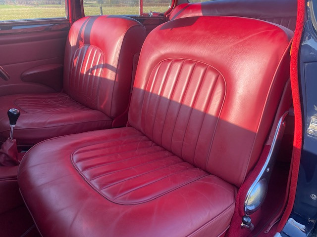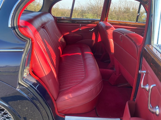 1960 Jaguar Mk. II 3.8 Manual/Overdrive in Indigo Blue with contrasting red leather upholstery and chrome wire wheels. Delivered new to South Africa an early matching-numbers example. Repatriated in 1990 with a recent sympathetic restoration completed by the Lewmark Auto Company with this still standing the test of time. Sensible upgrades, with more modern motoring in mind, include an alloy radiator, four-pot front brake calipers, Koni Classic shock absorbers and a stainless steel exhaust.