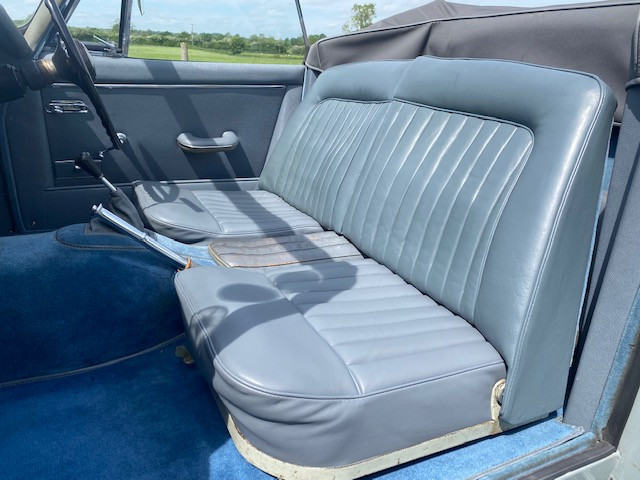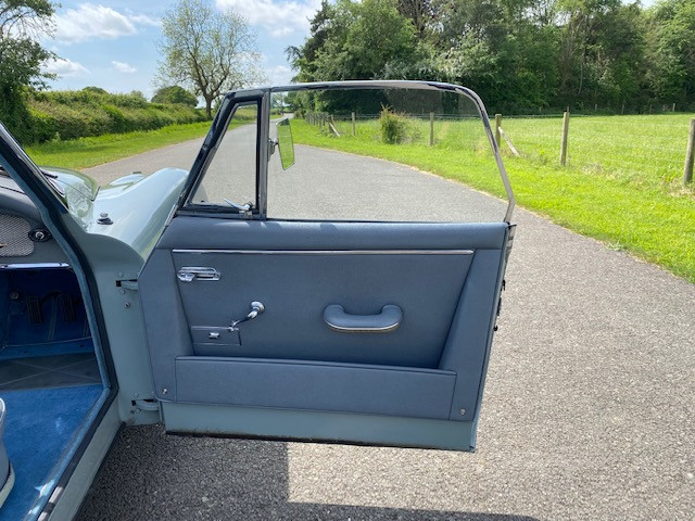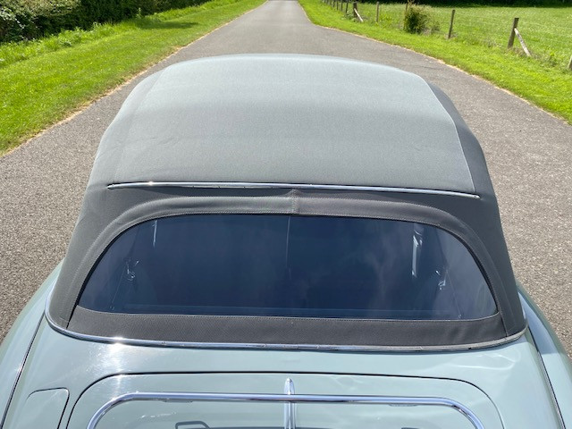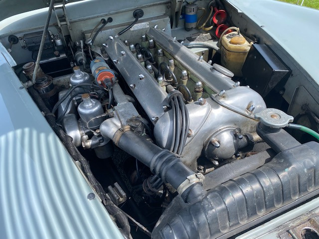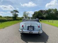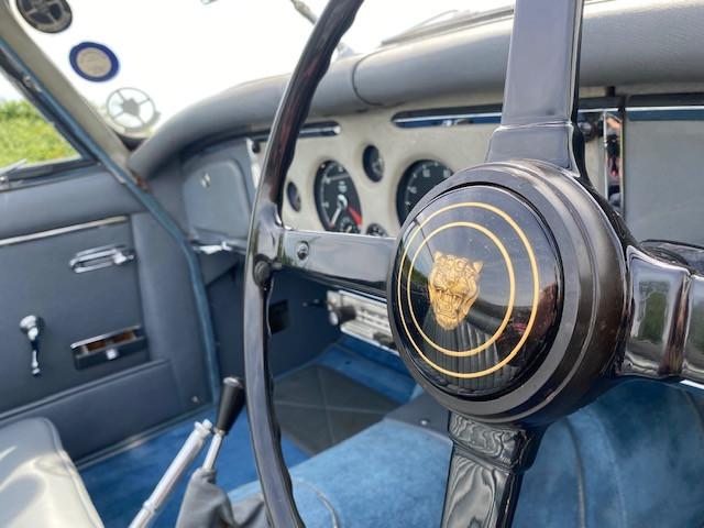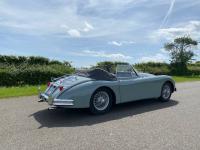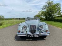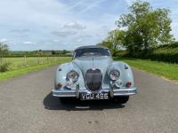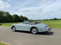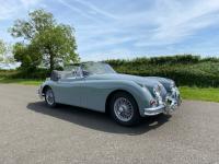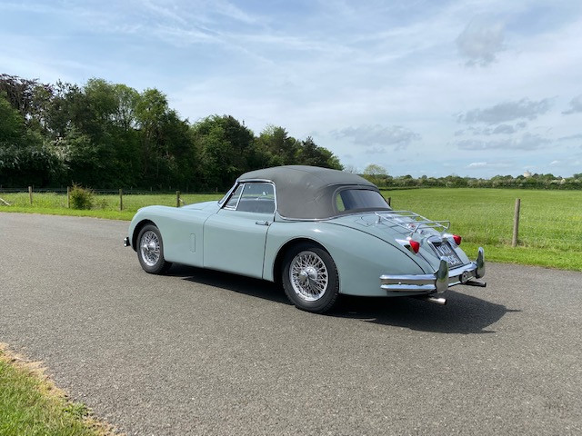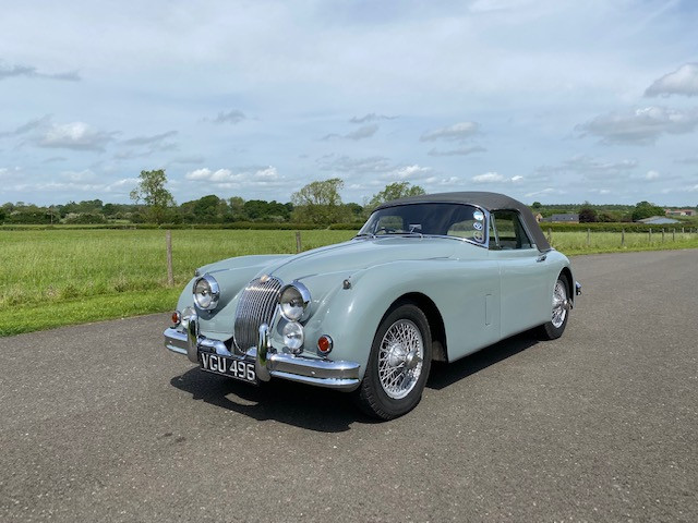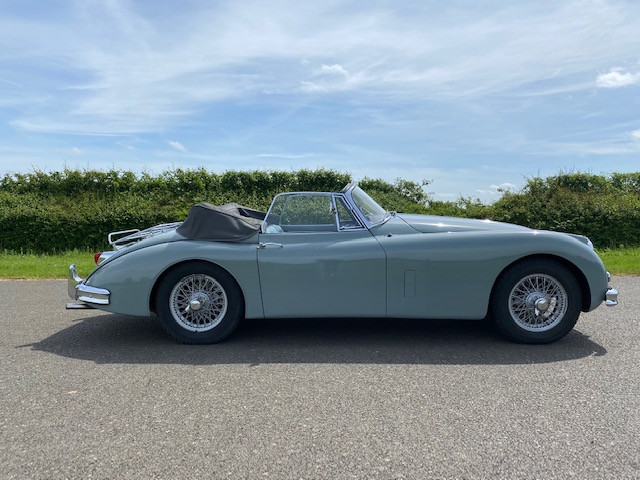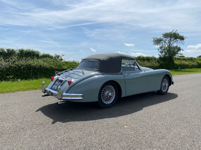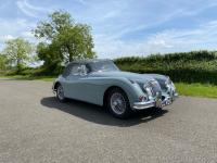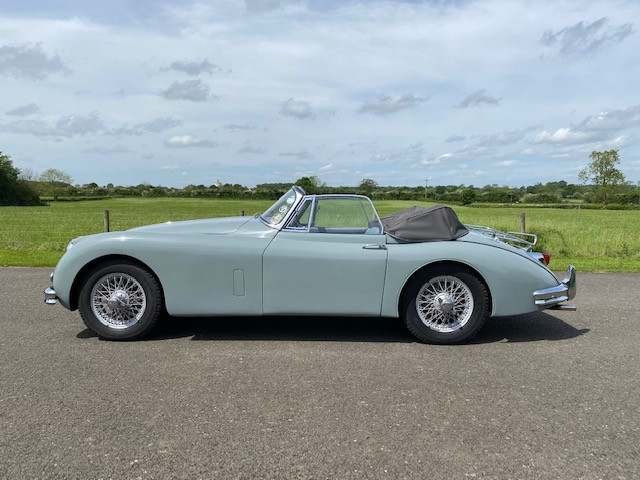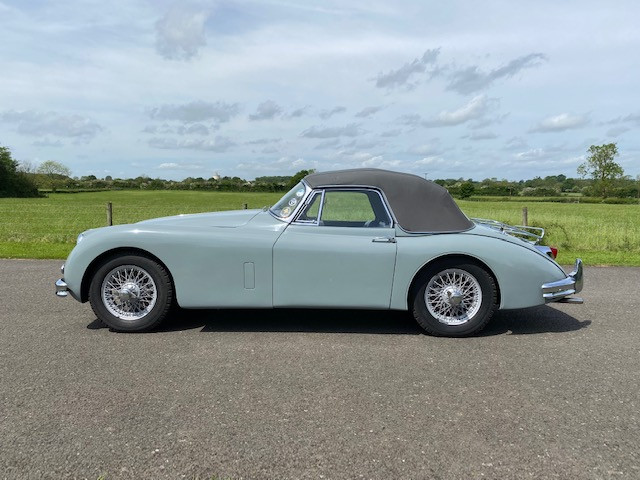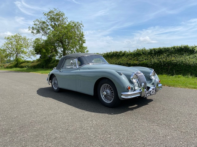 1958 Jaguar XK150 SE 3.4 DHC in Mist Grey trimmed with pale blue interior and grey hood. Original SE model with manual transmission and overdrive , disc brakes and the more powerful 210 BHP engine.