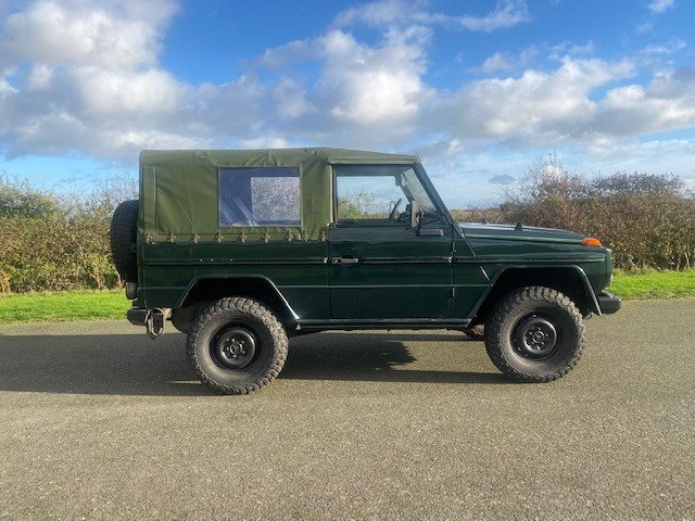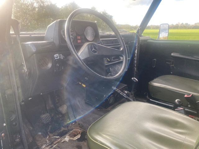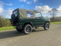 1991 Mercedes G Wagon GD250. 2.5l diesel Left Hand Drive in Green with a green plastic soft top and green interior.