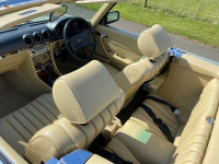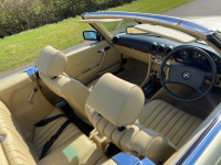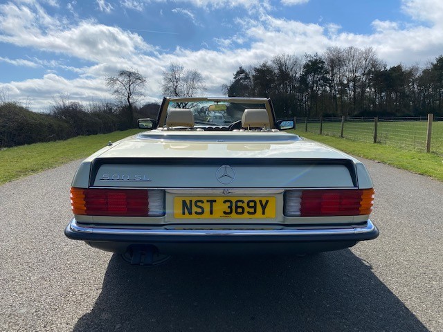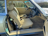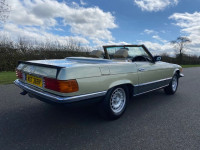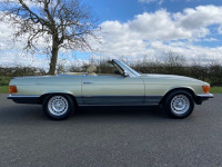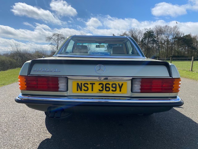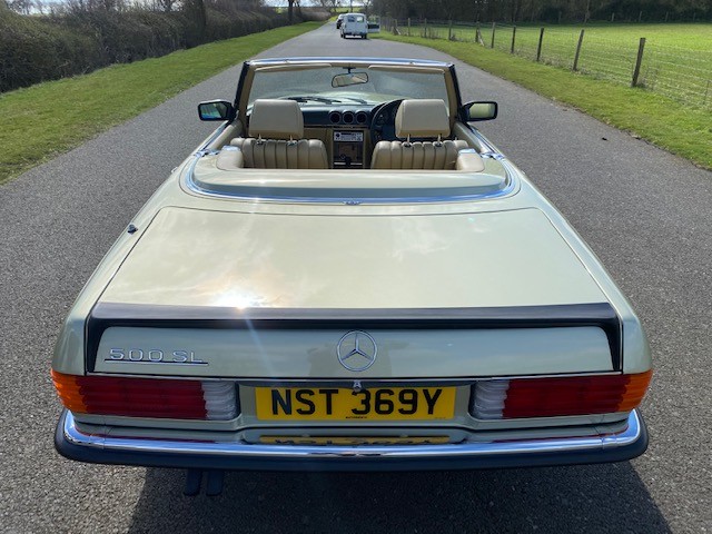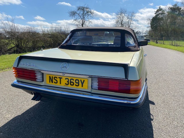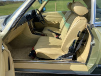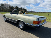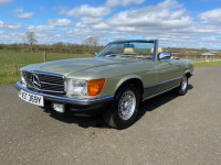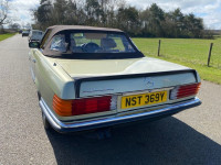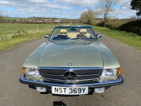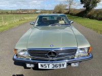 1983 Mercedes Benz 500 SL R107 in Thistle Green Metallic with a Cypress Green metallic hardtop, Dark brown soft-top, and Beige upholstery. Only 18700 miles from new. This cracking 500 SL has had just three owners from new and an exceptionally original example. Chassis number 002401 was supplied new by Regent Garage Gwynedd to local resident G. Thomas Esq on January 1st 1983. Befitting its status as Mercedes Benz's flagship sports car at the time the 500 SLs impressive specification encompassed a limited slip differential, cruise control, paint coat preservation, heat absorbing glass, headlamp wash / wipe, ABS brakes and rear seats. Sold by Mr Thomas to its next owner on June 1st 1995 for the princely sum of £27500 'NST369Y' its warranted to have covered just 18700 miles from new.