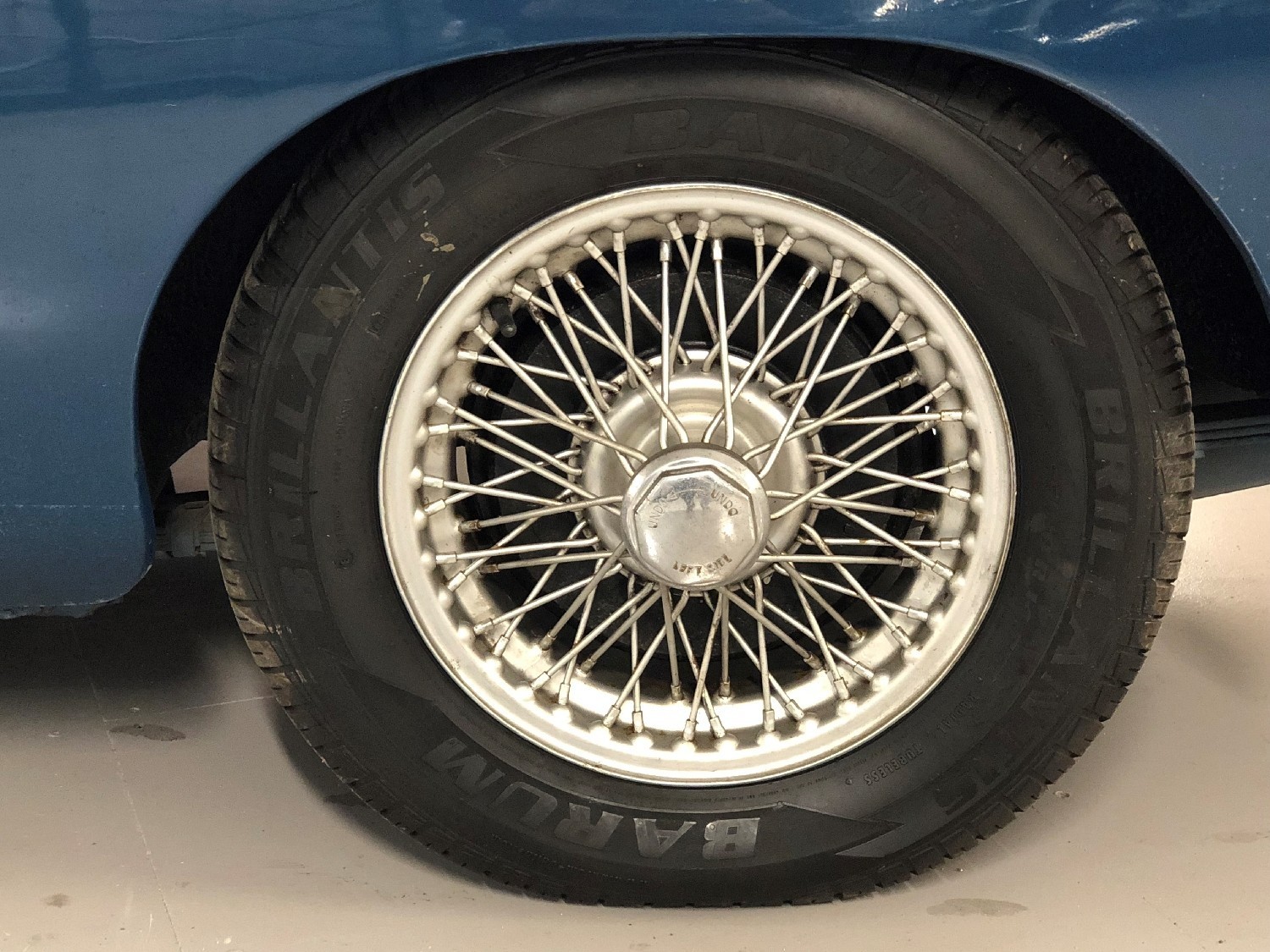 well and is fitted with a wood rim steering wheel and rides on wire wheels. The interior is in