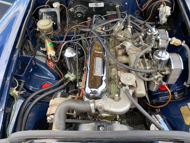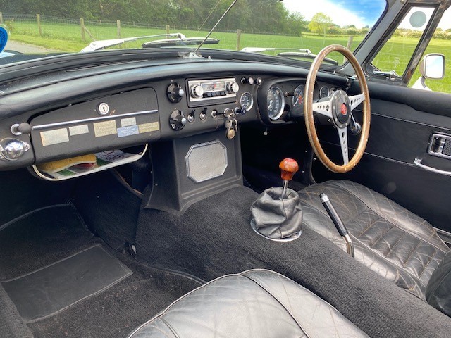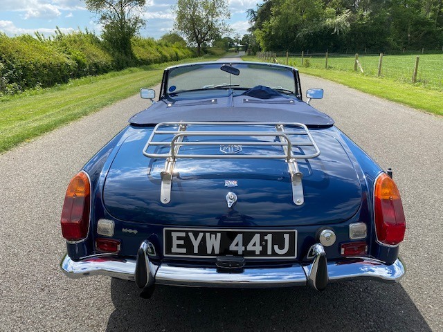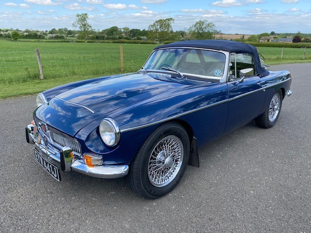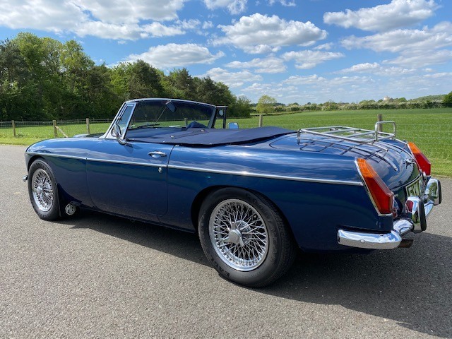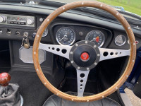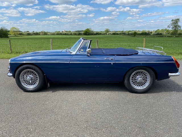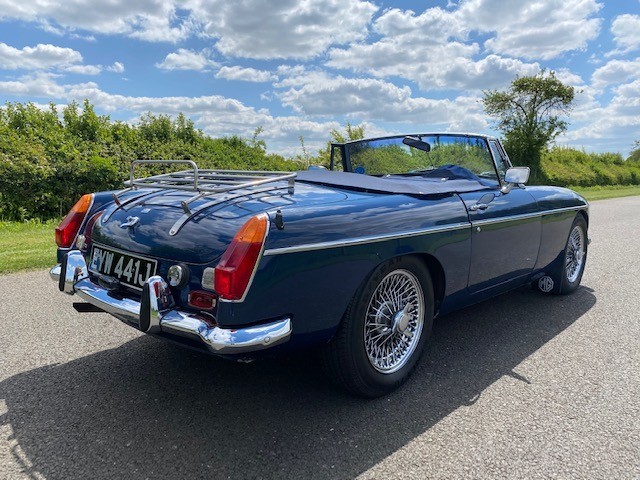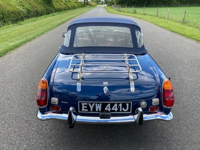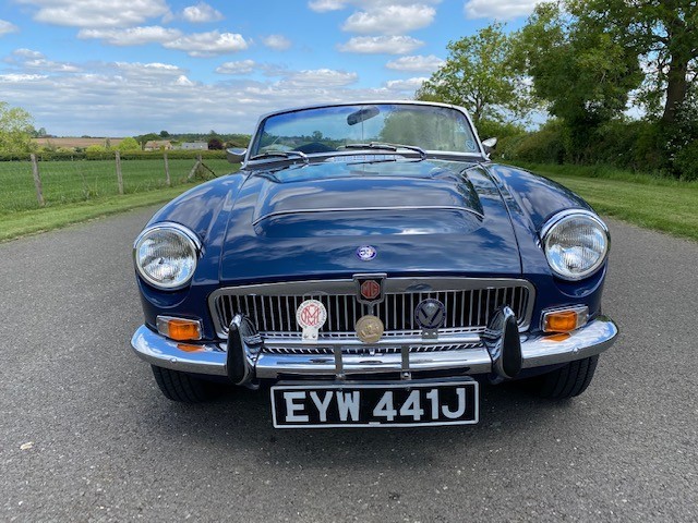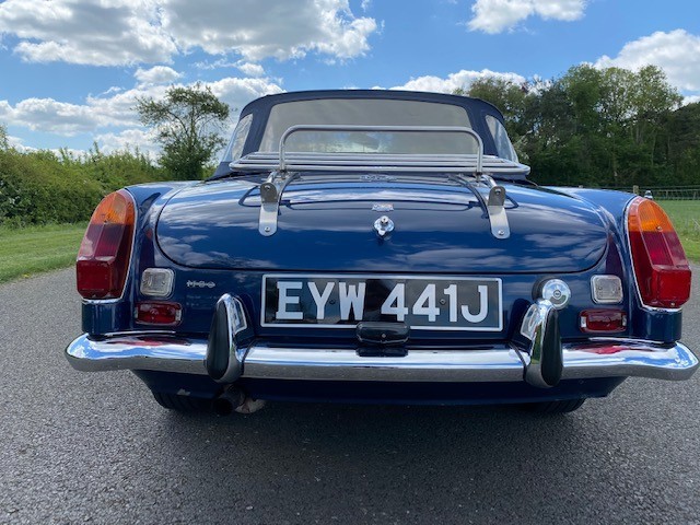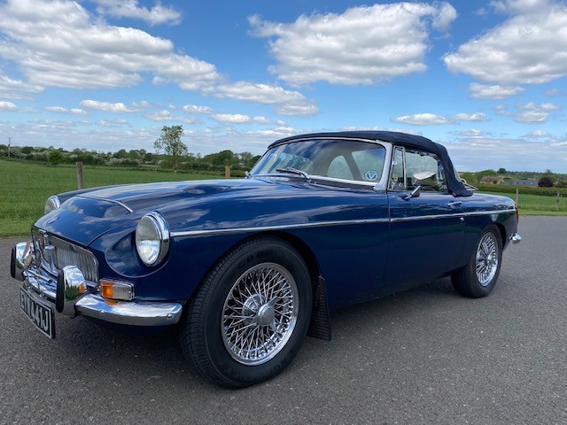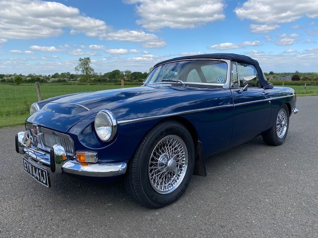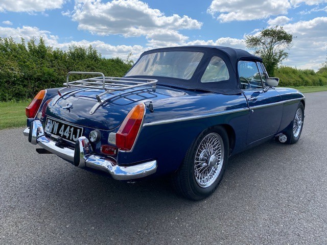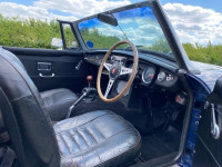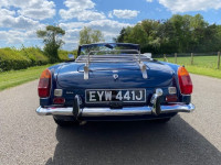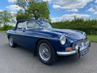 1971 MGC Roadster Manual with overdrive. Rolls Royce Seychelles Blue with black leather upholstery with blue mohair hood and matching tonneau cover. Supplied new to University Motors in London the accompanying Heritage Certificate shows that it is an original right hand drive home market car. The car also benefits from wire wheels, overdrive gearbox and packaway hood. This MGC is one of only two converted to a unique specification by University Motors of Cambridge. The Downton Stage Two tuned roadster boasts 140 BHP from its 3 litre straight 6 cylinder engine, special wide tyres on 72 spoke wire wheels, uprated suspension and was the second to last MGC produced. University Motors purchased the remaining MGC's from the factory when the model ceased production. This particular car left the factory in November 1969 and was not registered until January 1971 with University creating MG Specials during this time. This car is an older restoration but is a lovely solid very useable fun classic. The car starts on the button and drives very well with the big engine pulling well and a smooth gearbox with working overdrive on 3rd and 4th gears and is effortless when cruising and very happy in modern traffic. This MGC comes with a stack of invoices, MOT certificates, newspaper clippings at all of its shows, the original Passport to Service and manuals and still retains its original number plate. A fresh MOT will be applied upon sale. This MG is just waiting to be enjoyed in new hands. Absolutely any inspection is welcome. All major debit and credit cards accepted. Please contact us for any further information. UK mainland delivery included.