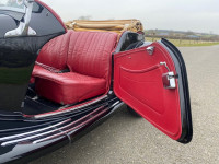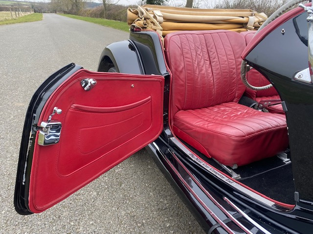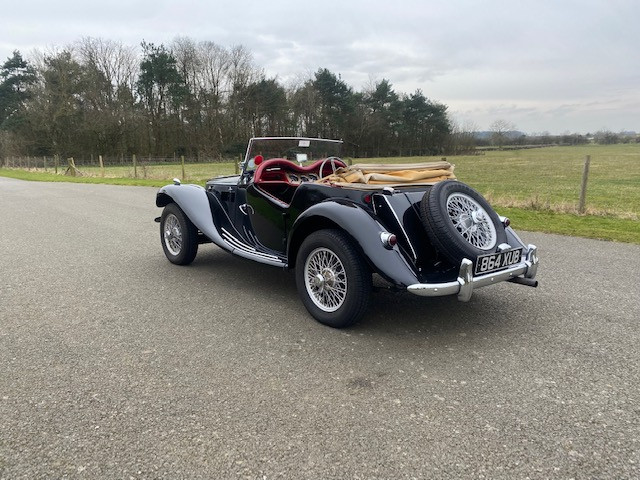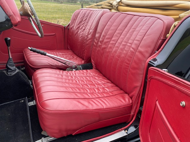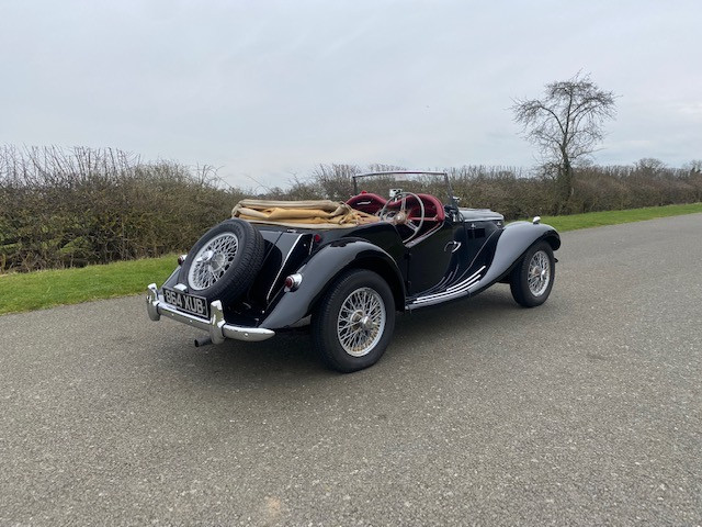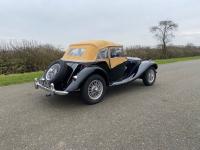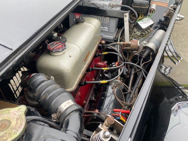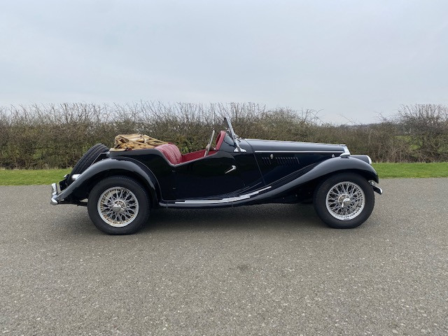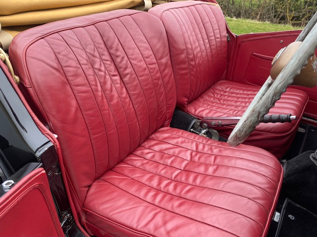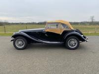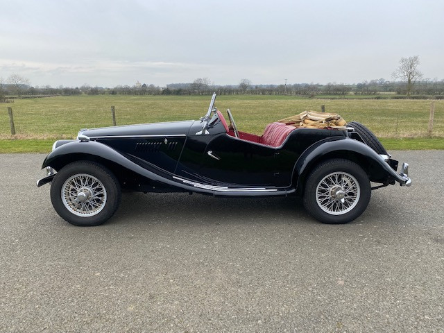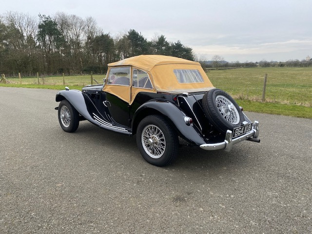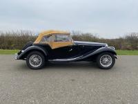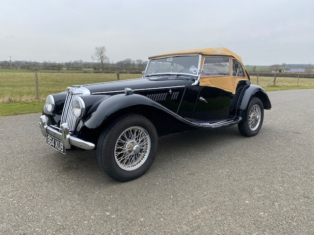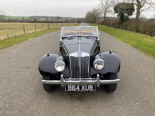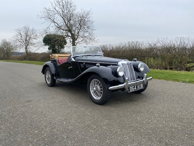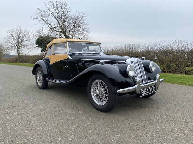 1953 MG TF 1250cc in Black with red leather interior and tan hood and side screens. The TF was introduced in October 1953. Although mechanically very similar to its TD predecessor, the provision of a shorter radiator, revised wing line and faired-in headlamps lent it an altogether sportier air.