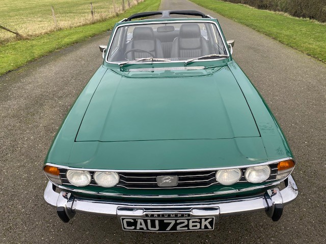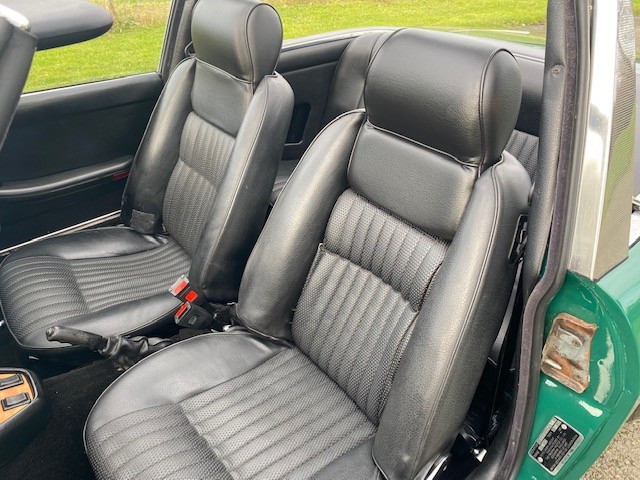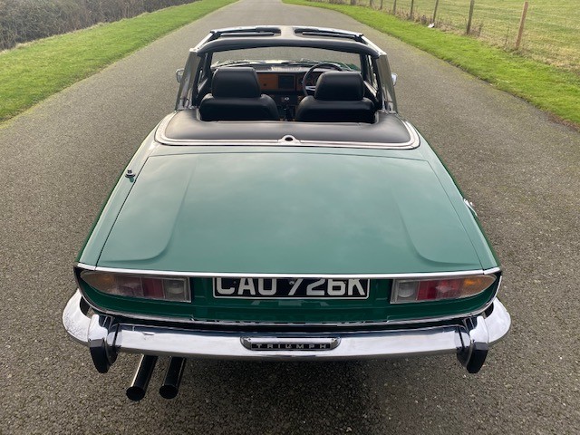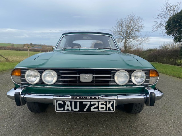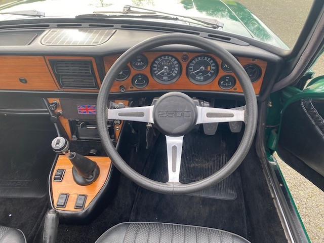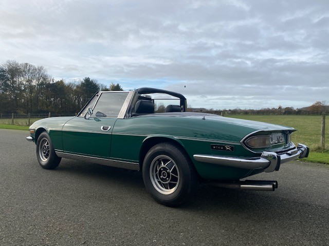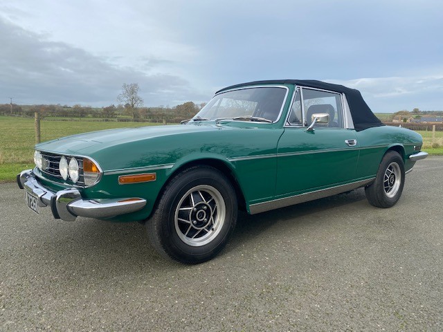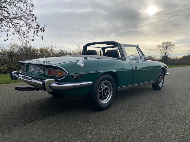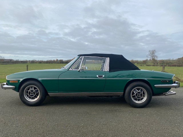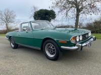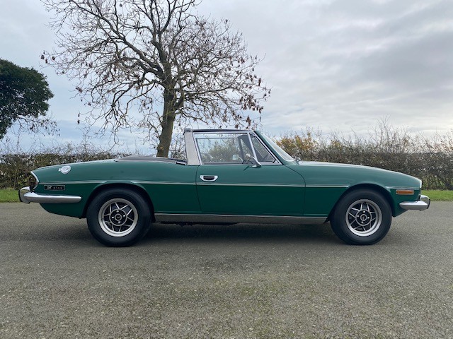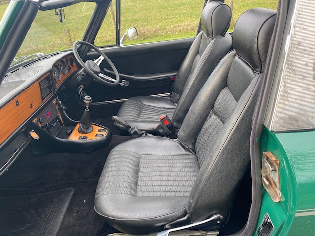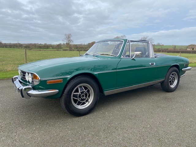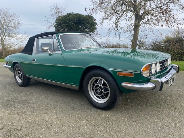 1972 Triumph Stag 3.0 V8 MK II Manual Overdrive. Emerald Green with black upholstery and a new black mohair hood. This Stag comes with it's original Passport to Service and was originally sold to Mr Hudson of Wollaton. Starting on the button and driving fantastically this Triumph Stag has been subject to a Weber Carb conversion meaning as they state on their website 'Idling and fuel economy will be a revelation, and you will be able to use and enjoy your car without worry. No more tweaking, balancing, flooding or sticking air valves to worry about. There should be no concerns about lack of power or torque either.'