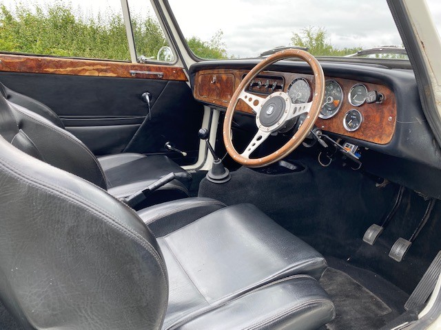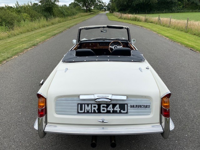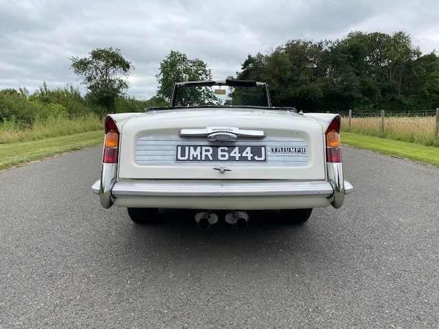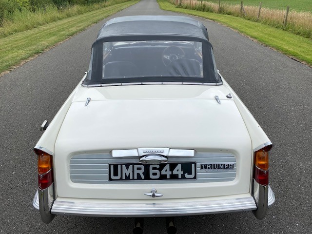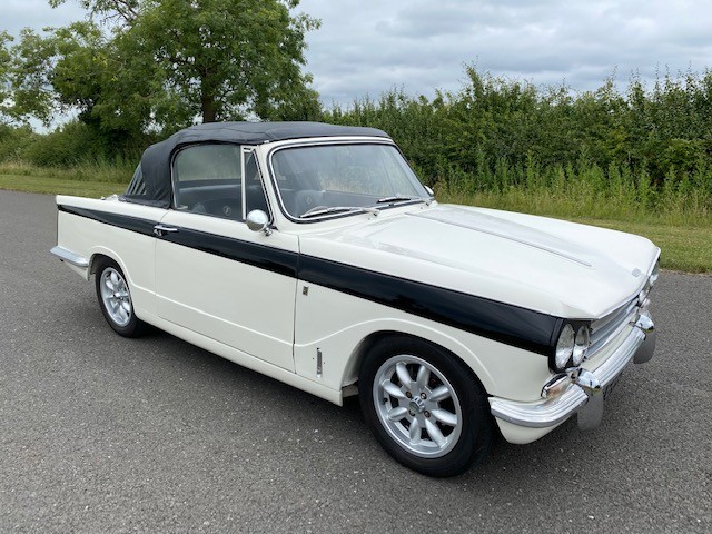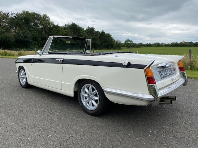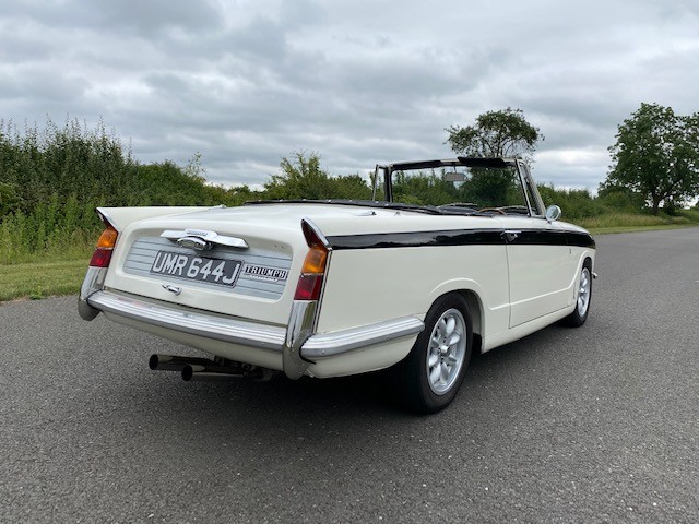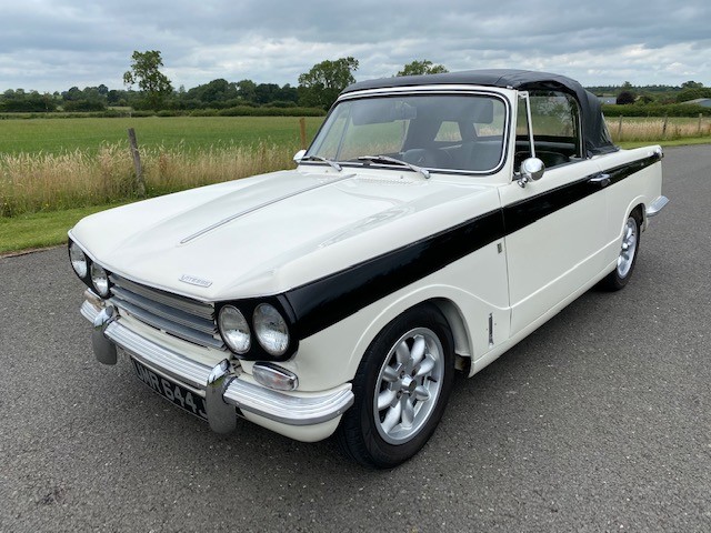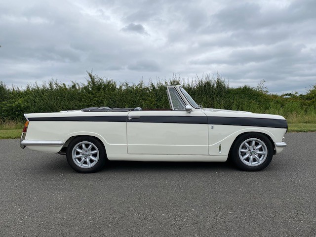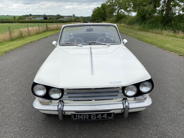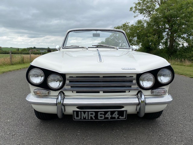 1971 Triumph Vitesse Convertible MK II. 2.0 Litre. Manual with Overdrive. Factory white with black leather upholstery and black hood. The Triumph has a CV chassis number which shows it is a genuine factory convertible.